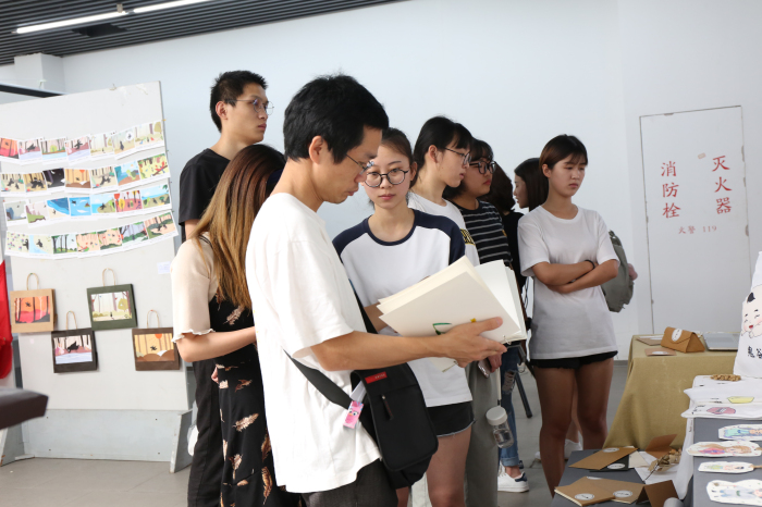 展会现场,大量师生驻足观看。尤其是在动画衍生产品类作品里,学生设计师们独具匠心的将大众日常接触的诸如包装盒、纪念章、海报、手机壳、抱枕、手提袋等生活用品进行重新设计。这些学生作品充分体现了艺术设计系师生们力图突破传统设计局限,从设计手法、配饰等独特视角重塑对大众生活必需品的认识,也让现场观众们感受到了原创设计的魅力。