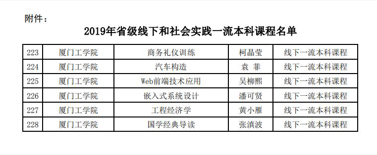 日前,福建省教育厅印发《福建省教育厅关于公布 2019 年省级线下和社会实践一流本科课程名单的通知》(闽教高〔2019〕23 号),公布2019年福建省一流本科课程名单。我校商务礼仪训练、汽车构造、Web前端技术应用、嵌入式系统设计、工程经济学、国学经典导读等6门课程获批2019年省级线下一流本科课程。