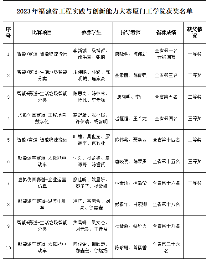 此次大赛得到了学校领导的高度重视和支持,工程坊、机械电气与信息工程学院、数据科学与计算机学院以及商学院的相关专业老师积极参与、指导我校学生参赛,经过校内层层选拔,有14支参赛队共56名学生代表我校前往福州大学参加省赛,其中,10支队伍进入决赛,都取得了不错的成绩,充分展示出我校学生扎实的工学素养、创新活跃的动手创造能力和奋发有为的竞赛风貌。