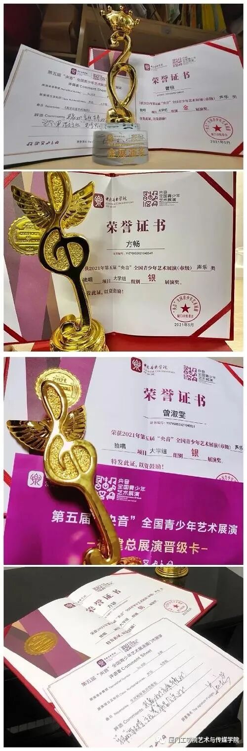 2021年5月16日,中央音乐学院主办的第五届“央音”全国青少年艺术展演厦门市级比赛在厦门国际会议中心举行。我院音乐表演专业的四名同学在指导老师于雯秀的带领下荣获一项金奖,两项银奖,一项铜奖的优异成绩。