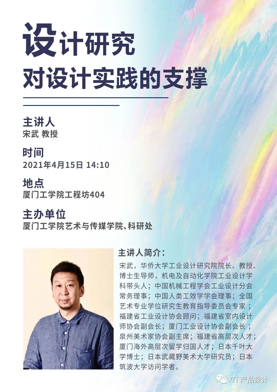 宋武,华侨大学工业设计研究院院长、教授、博士生导师,机电及自动化学院工业设计学科带头人;中国机械工程学会工业设计分会常务理事;中国人类工效学学会理事;全国艺术专业学位研究生教育指导委员会专家;福建省工业设计协会顾问;福建省室内设计师协会副会长;厦门工业设计协会副会长;泉州美术家协会副主席;福建省高层次人才;厦门海外高层次留学归国人才;日本千叶大学博士;日本武藏野美术大学研究员;日本筑波大学访问学者。