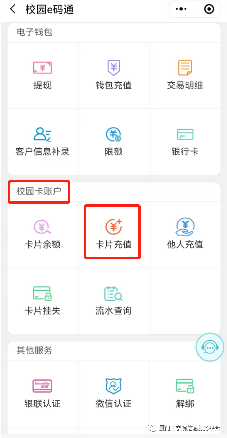 为了保障校园卡充值系统安全,2023年4月28日起将暂停使用建行手机银行APP充值校园卡,改为“校园e码通”微信小程序充值校园卡,具体操作如下: