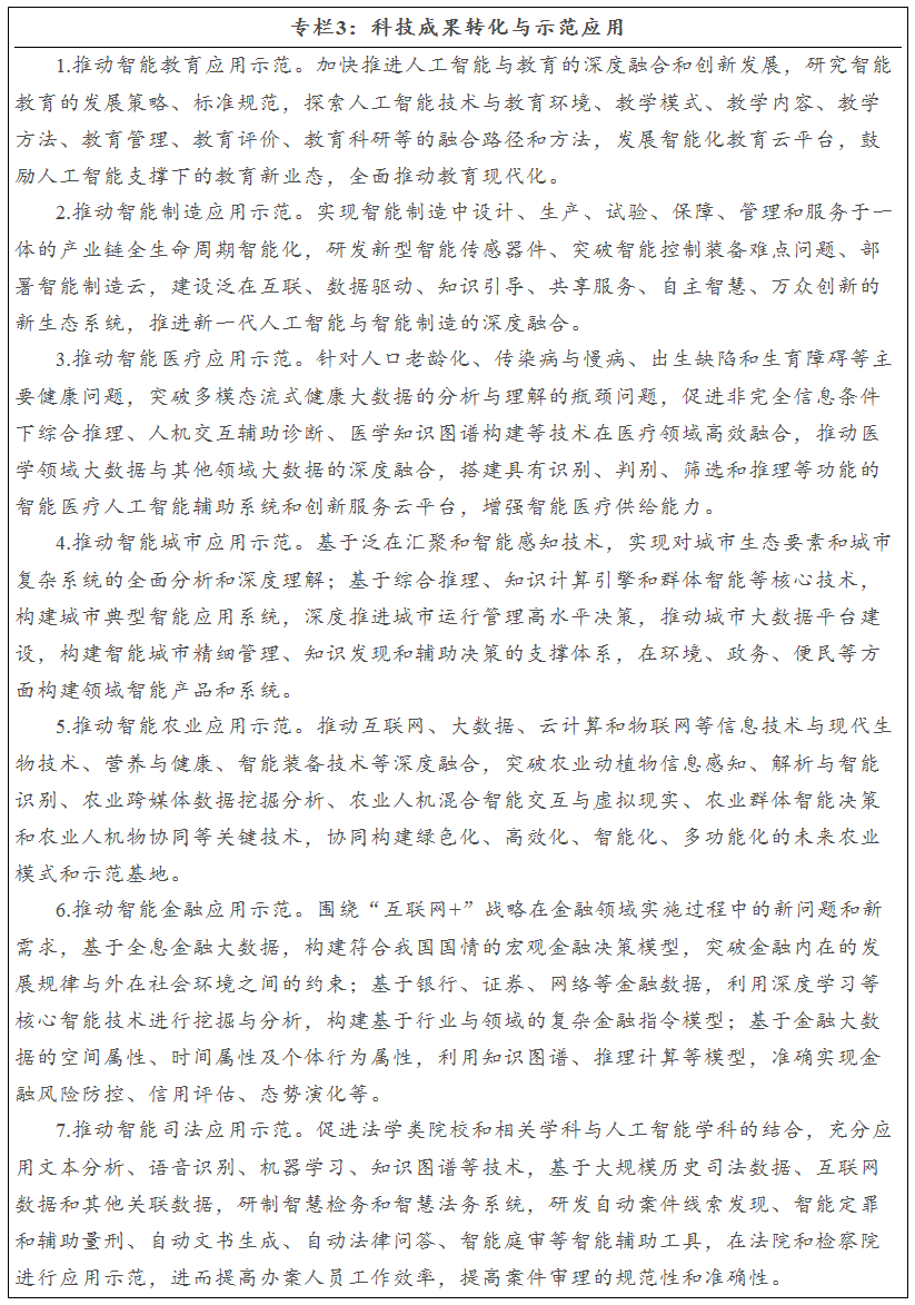 14.加强重点领域应用。实施“人工智能+”行动。支持高校在智能教育、智能制造、智能医疗、智能城市、智能农业、智能金融、智能司法和国防安全等领域开展技术转移和成果转化,加强应用示范;加强与有关行业部门的合作,推动在教育、文化、医疗、交通、制造、农林、金融、安全、国防等领域形成新产业和新业态,培育一批人工智能技术引领型企业,推动形成若干产业集群和示范区。