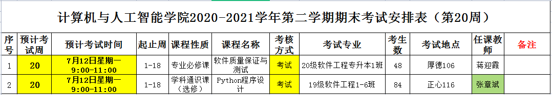 (第20周)2020-2021学年第二学期专业课期末考试安排表