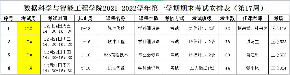 (第17周)2021-2022学年第一学期专业课期末考试安排表