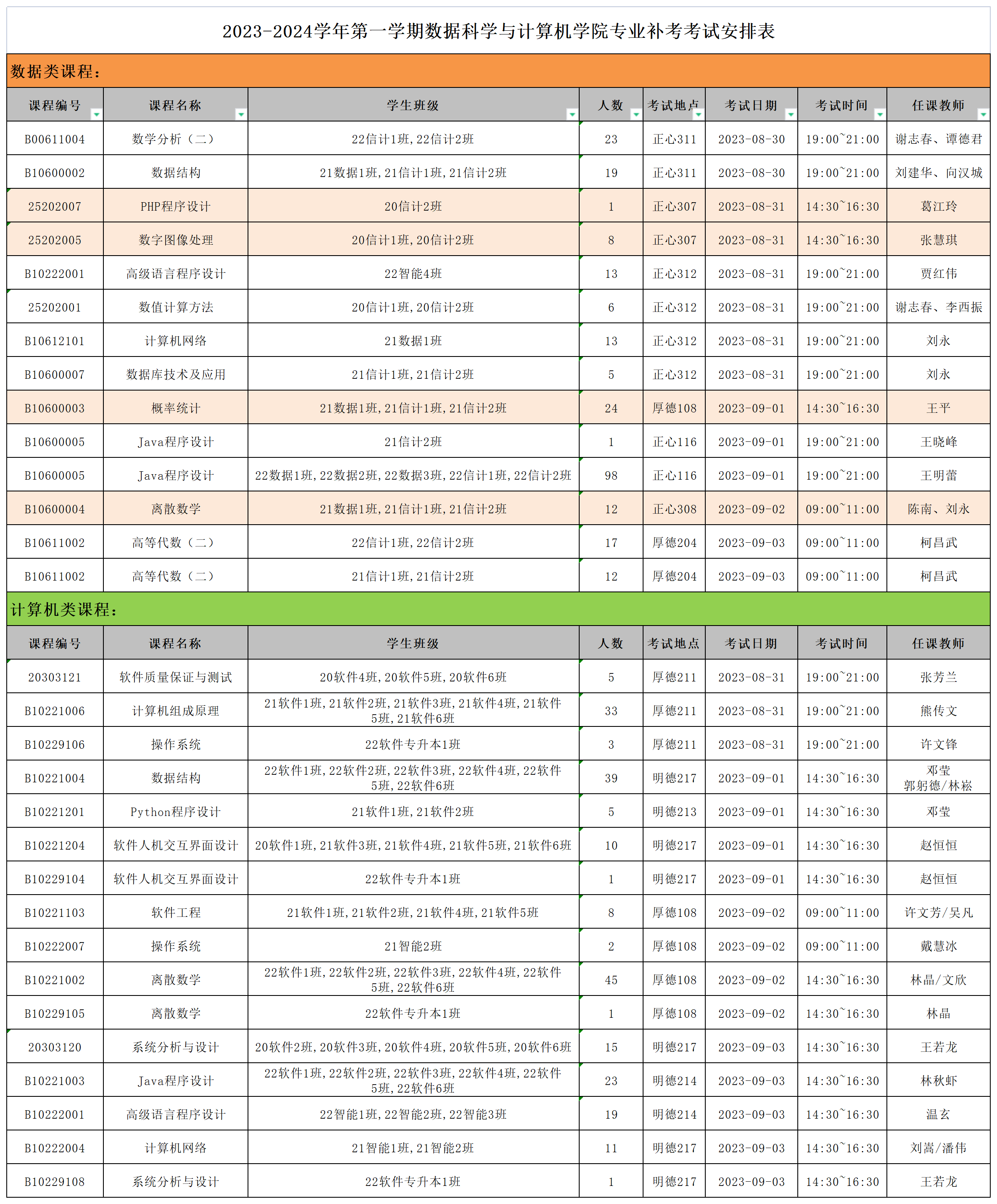 2023-2024学年第一学期数据科学与计算机学院专业补考考试安排表