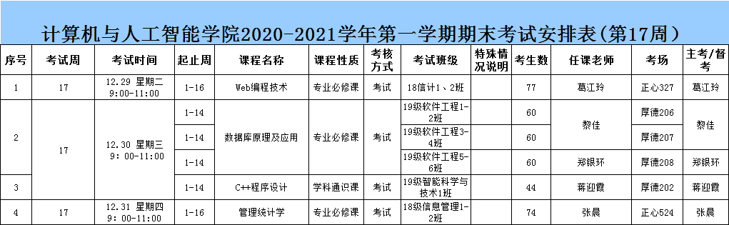 计算机与人工智能学院2020-2021学年第一学期期末考试安排表 (第17周)
