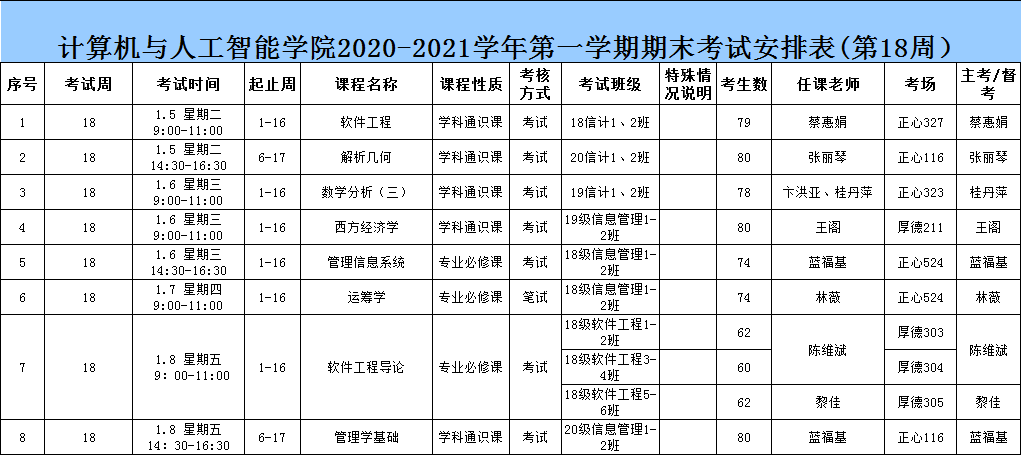 计算机与人工智能学院2020-2021学年第一学期期末考试安排表 (第18周)