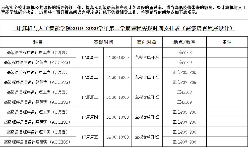 全校计算机公共课程(高级语言程序设计)答疑安排表