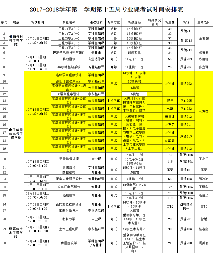 2017-2018学年第一学期第十五周专业课考试时间安排表