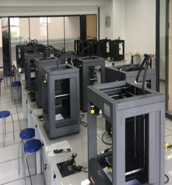 实验室配备了3D打印实验教学所需的基础设备,有桌面级3D打印机20台,手持式扫描仪2台,共22台套。该实验室主要面向机械工程、机电电子工程等专业,开设《材料成形技术基础》等课程中的3D打印相关实验,同时为学生的毕业设计、创新设计、项目赛事及教师的教学科研提供场所和设备。