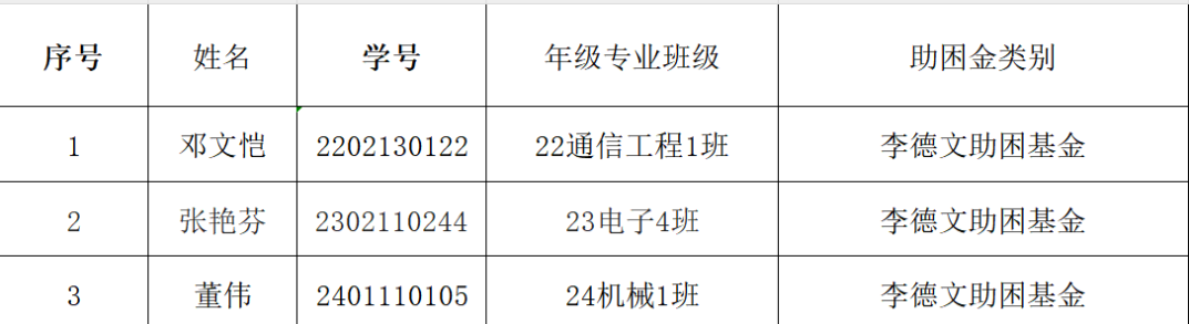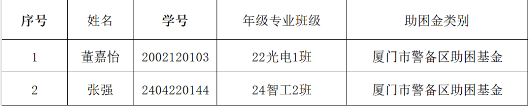 经学生本人申报、院务委员会评选推荐,拟推荐邓文恺等3名同学参评李德文助困基金,拟推荐董嘉怡等2名同学参评厦门市警备区助困基金,现将具体名单予以公示。