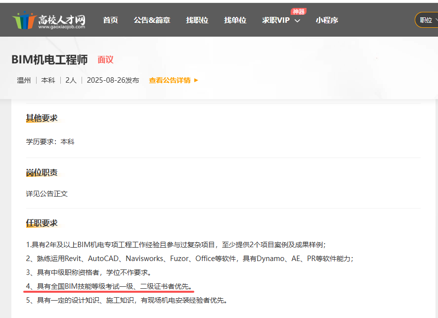 ▪ 某市国有企业智能制造控股集团2025年秋季招聘BIM机电工程师任职要求:“具有全国BIM技能等级考试一级、二级证书者优先。”