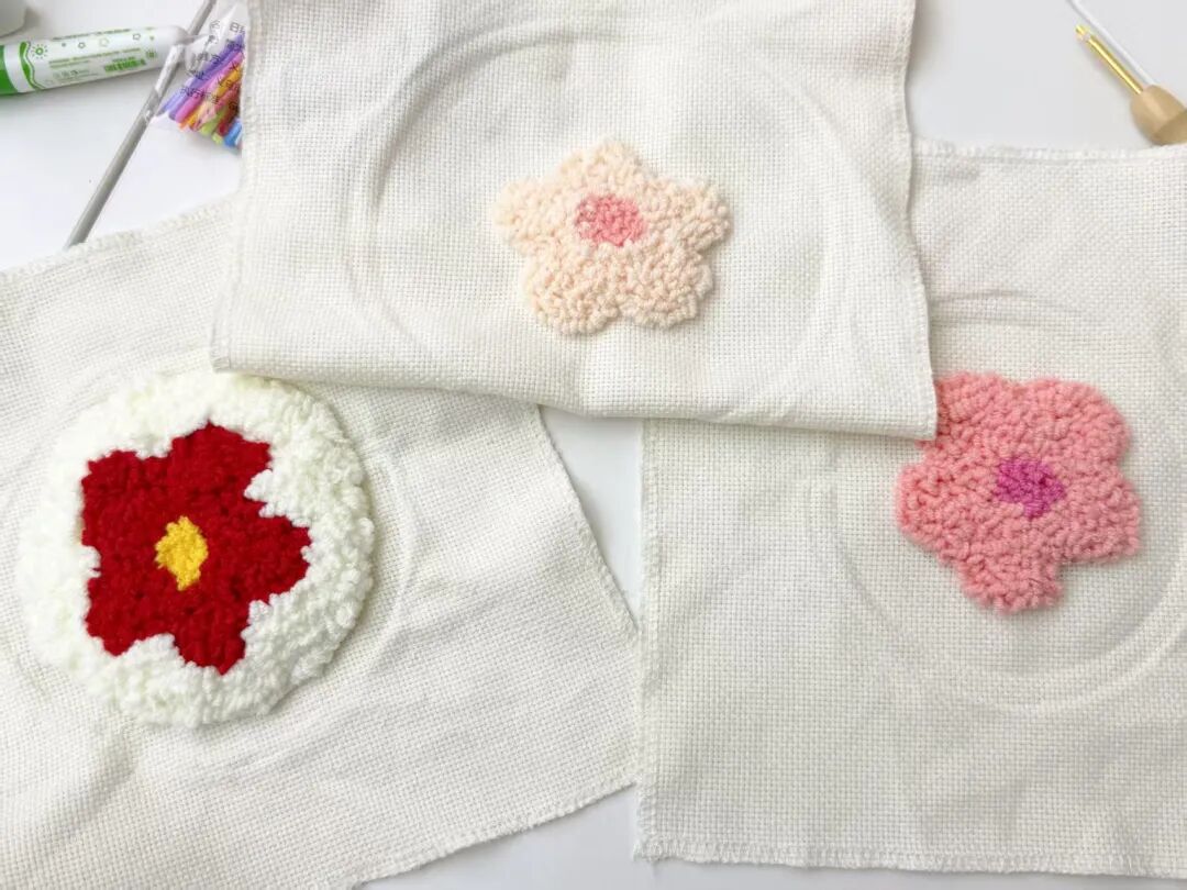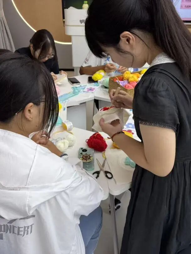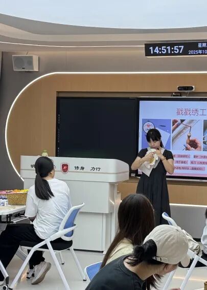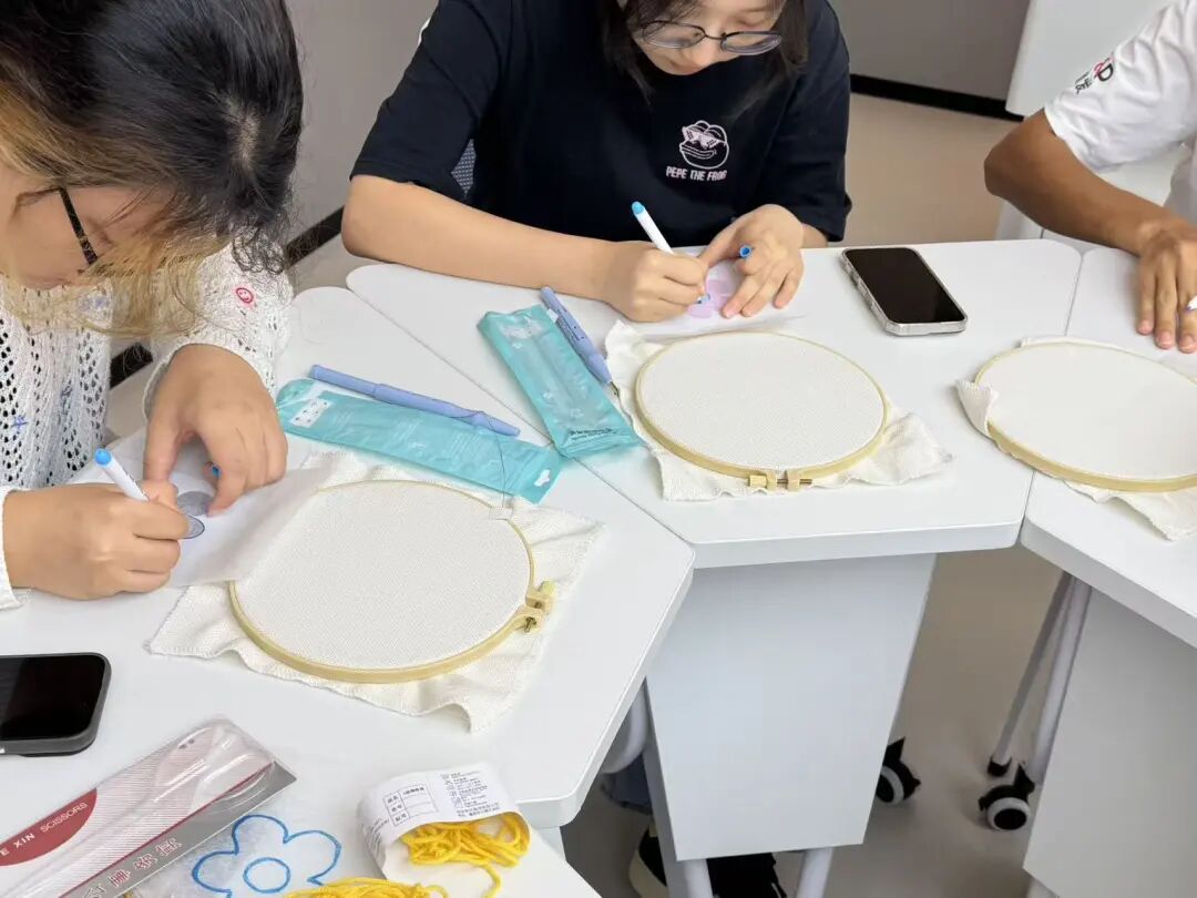 在老师的悉心指导下,同学们首先系统学习了戳戳绣的基础技法——穿线、持针方法和基本戳法。掌握要领后,大家纷纷动手,开始实践“戳出你的第一朵花”环节,同学们专注地挑选颜色、运用针法,在布料上勾勒属于自己的图案,每人着手完成一个简单的单色或双色戳戳绣杯垫或小挂饰。虽然是初次尝试,但每个人的脸上都洋溢着专注与喜悦。活动现场氛围温馨,布料与针线细细摩擦,仿佛正轻轻诉说着时光的静好。