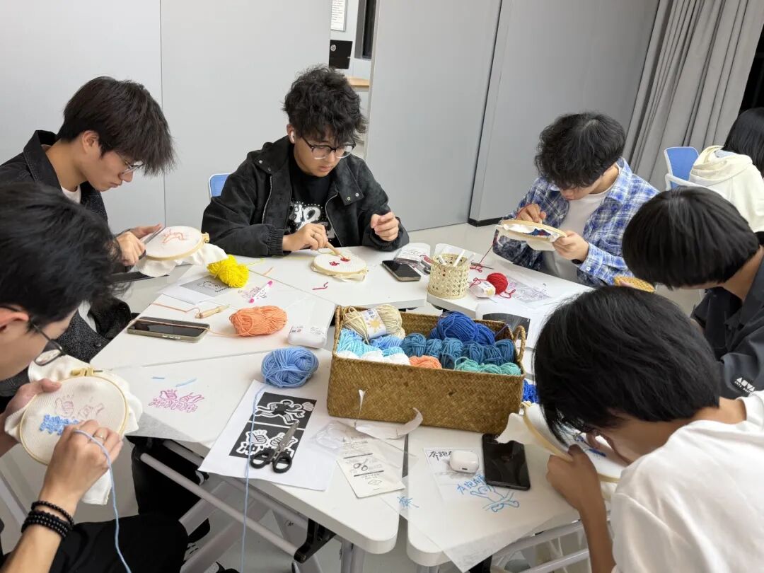 在前两次课程的铺垫过后,同学们带着AIGC生成的设计稿,在耿老师的指导下,以针线为笔,将秋季马拉松的热血与诗意,绣进方寸布料之中