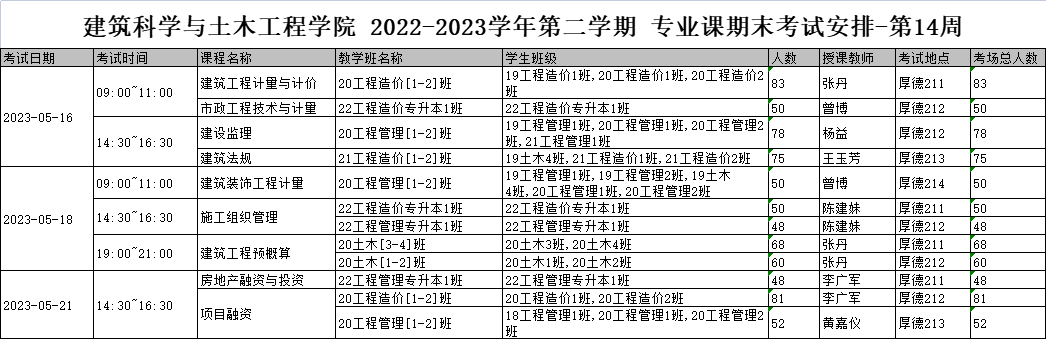 2022-2023学年第二学期建筑科学与土木工程学院专业课考试安排第14周