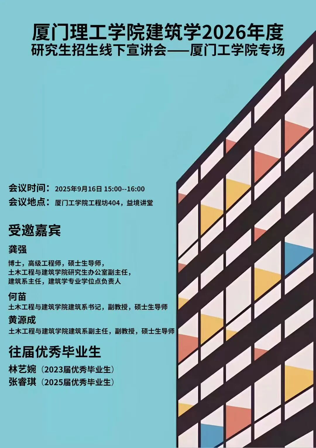2025年9月16日下午,由建筑科学与土木工程学院主办的厦门理工学院建筑学2026年研究生招生宣讲会在工程坊404益境讲堂成功举办。