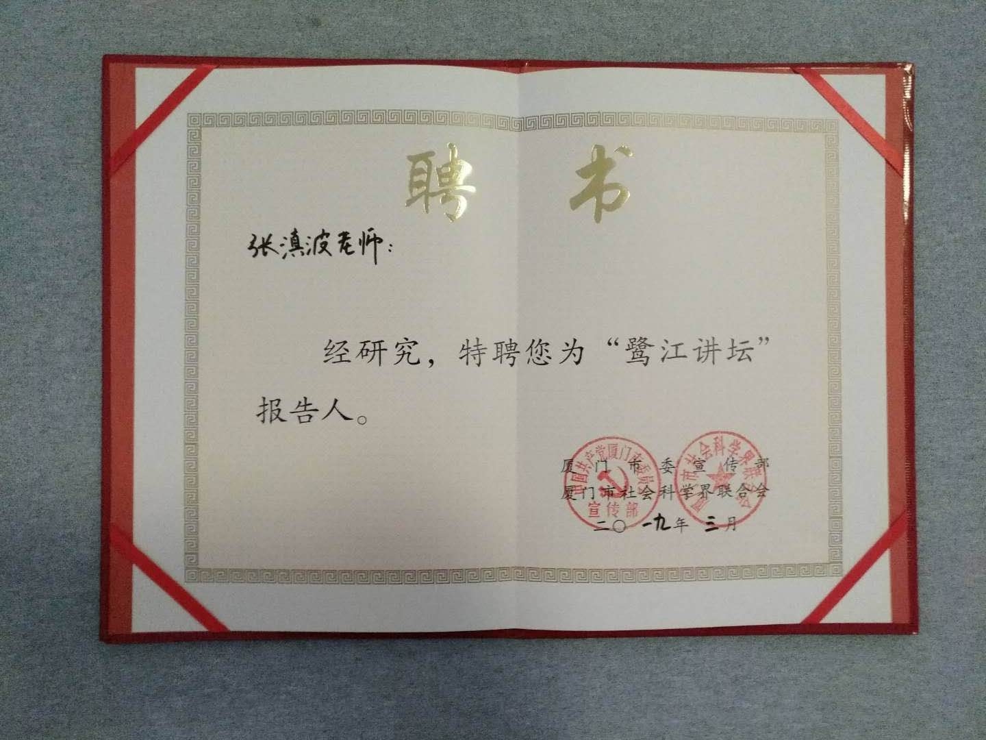 近日,喜讯传来,我校文化与传播学院中文系主任张滇波副教授荣入厦门市委宣传部、厦门市社科联举办的“鹭江讲坛”报告人。张滇波副教授提交的报告题目有二,一是“中国古典宗教与当代人的信仰”,二是“华夏文化传统与当代文化自信建设”。