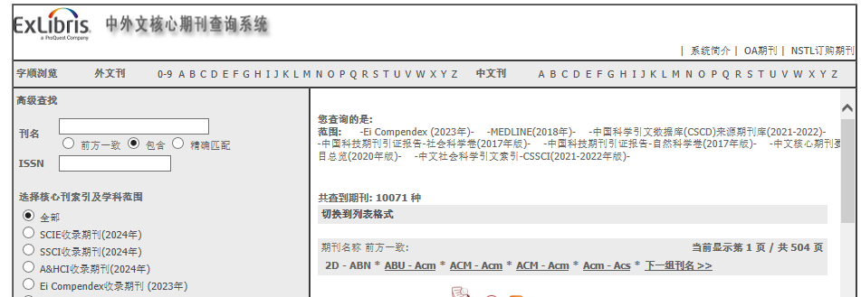 我校已订购的中国知网(CNKI)数据库提供1927种核心期刊的目录查询及全文下载服务。