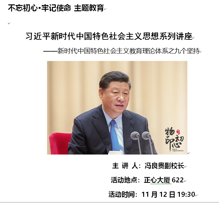 本周二晚上19:30冯良贵副校长为马克思主义学院全体教师(包括校内兼职教师)开展不忘初心·牢记使命主题教育活动,请各位老师(包括校内兼职教师)于11月12日(周二)19:20前到正心622参加讲座,届时需现场签到。同时也欢迎其他学院教师、书院辅导员参加讲座。