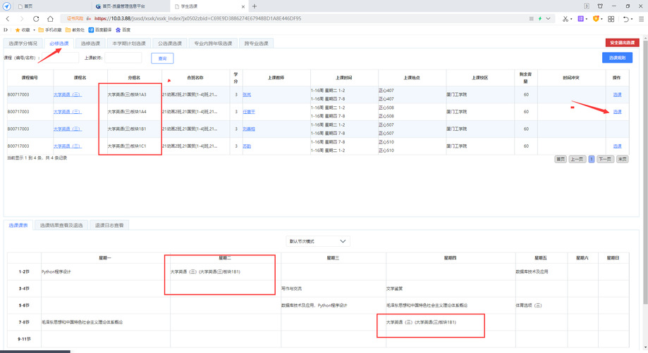 4.点击【必修选课】,进入选课体育选课页面,按个人需求,选择对应的班级。选课完成后查看【选课课表】确定是否 选上。