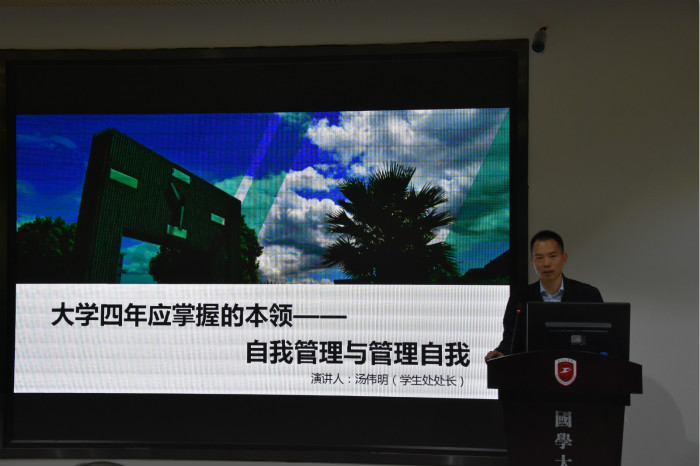主讲人汤伟明处长凭着自己在学生工作积累的经验和丰富的阅历,从“自我管理、情绪管理、压力管理、时间管理”四个方面着手,全面而系统的分享了关于大学生自我管理方面的心得,通过有趣且引人思考的故事和案例,深入阐述了自我管理和管理自我对于大学生成才成长的重要作用。