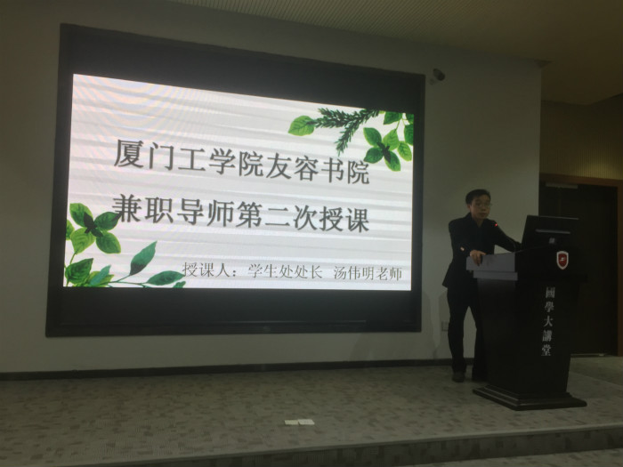 2018年1月4日下午,友容书院人才菁英班第二次授课讲座于正心大厦国学大讲堂举行,本次讲座邀请了学生处处长汤伟明老师为人才菁英班的同学授课,友容书院院长李子芳教授、副院长肖芳浩老师、书院办公室主任兼团委书记陈平民老师、全体友容书院导师及人才菁英班全体学员参加本次讲座,副院长肖芳浩老师主持本场讲座。