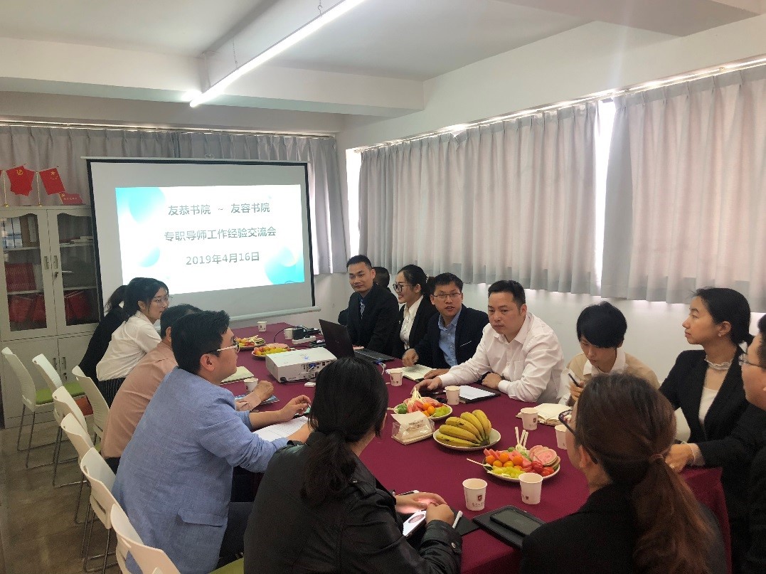 4月16日上午,友恭书院与友容书院在友容苑三楼会议室开展专职导师工作经验交流会。友恭书院院长黄华灿、副院长雷雨、友容书院院长李子芳、副院长雷卫斌以及友恭书院和友容书院全体专职导师参加此次交流会。