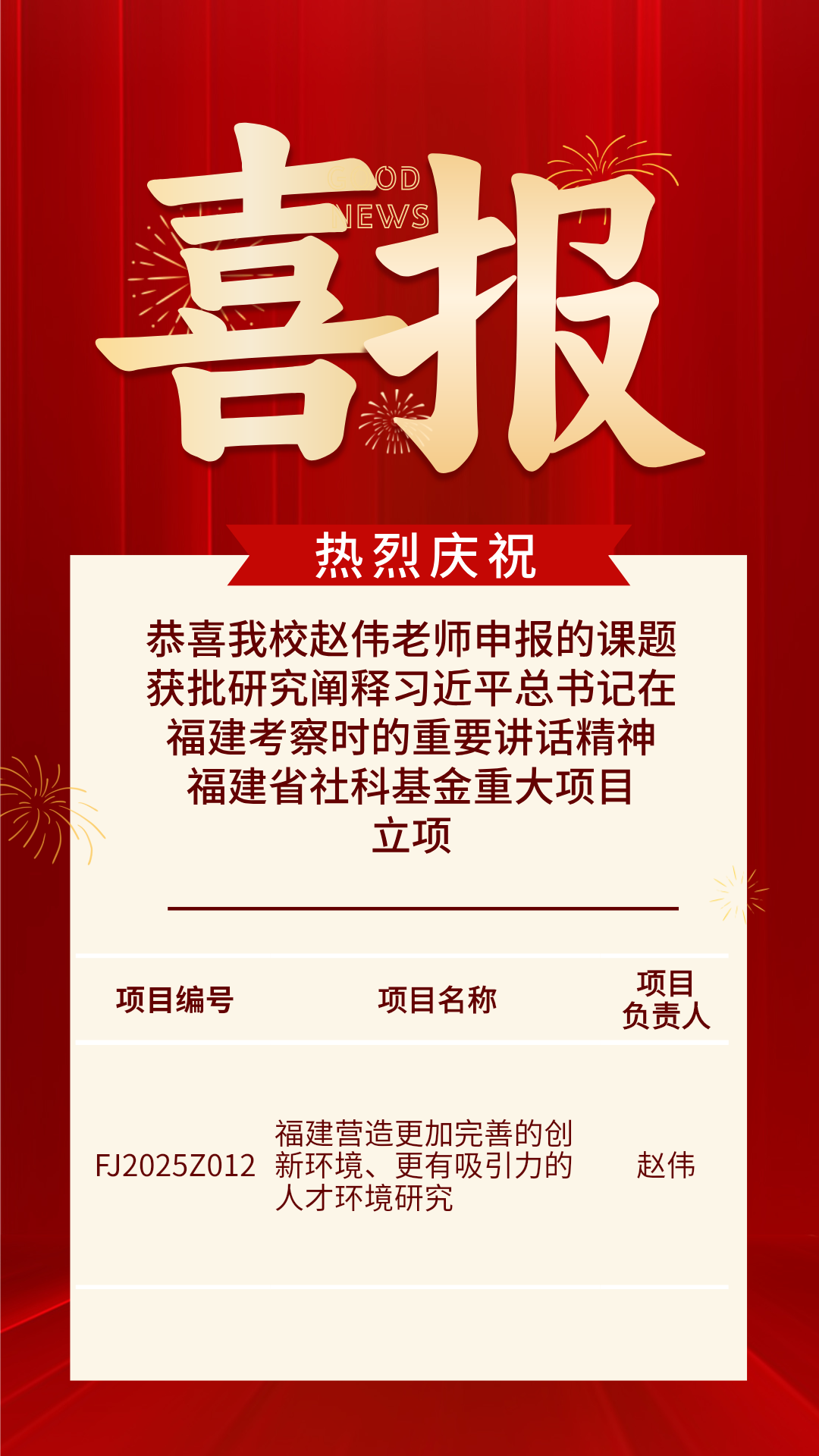 喜报 | 商学院赵伟老师申报的课题获批研究阐释习近平总书记在福建考察时的重要讲话精神福建省社科基金重大项目立项