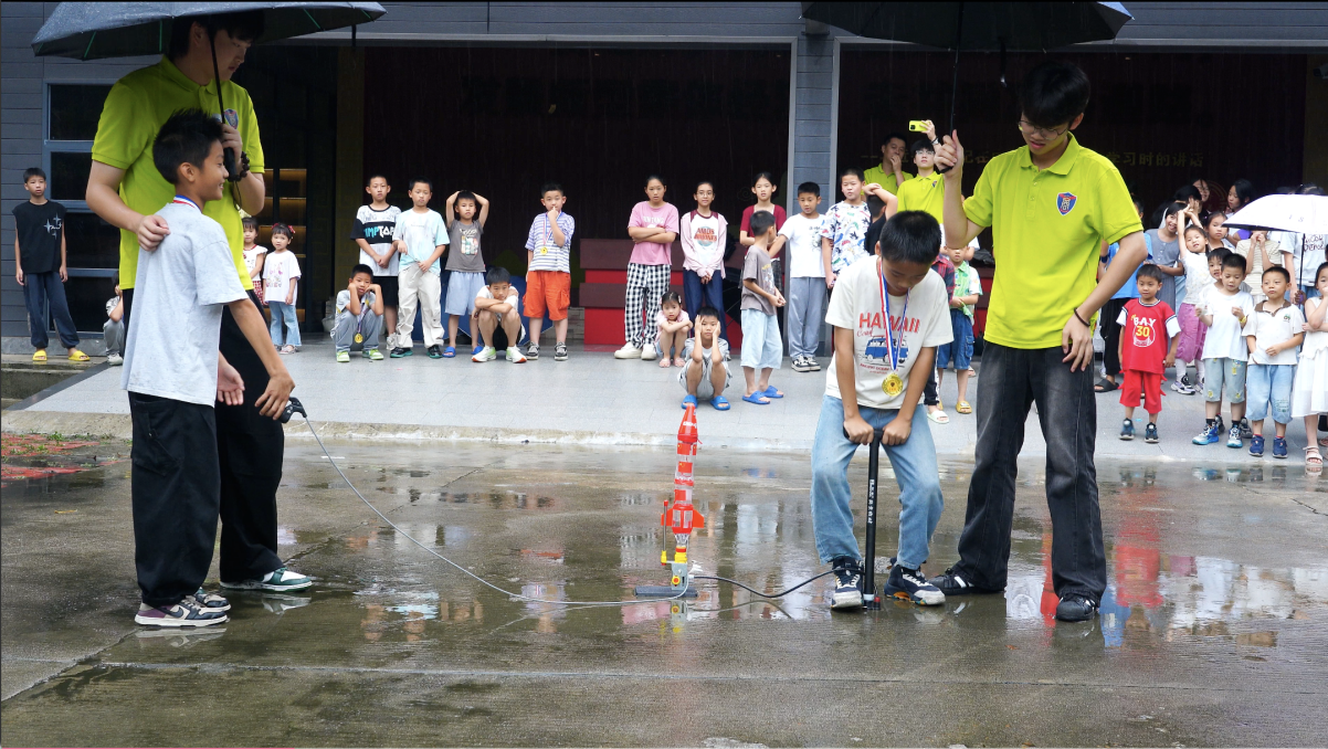 “商鹭绿芽”团队充分发挥高校科技创新优势,精心打造特色STEM教育课程体系。其中最具代表性的水火箭项目创新采用“原理动画+生活案例+实践操作”三维教学模式,通过生动形象的可视化动画演示反冲力原理,结合“气球放气”等生活常见现象类比解释牛顿第三定律,并组织学生分组完成从设计构思、材料组装到现场发射的全流程实践操作。当孩子们亲手制作的水火箭伴随着欢呼声腾空而起时,那些原本抽象的物理公式瞬间转化为直观震撼的科学体验,这种沉浸式的教学方式成功点燃了乡村青少年的科学探索热情,在他们心中播下了科技创新的种子。