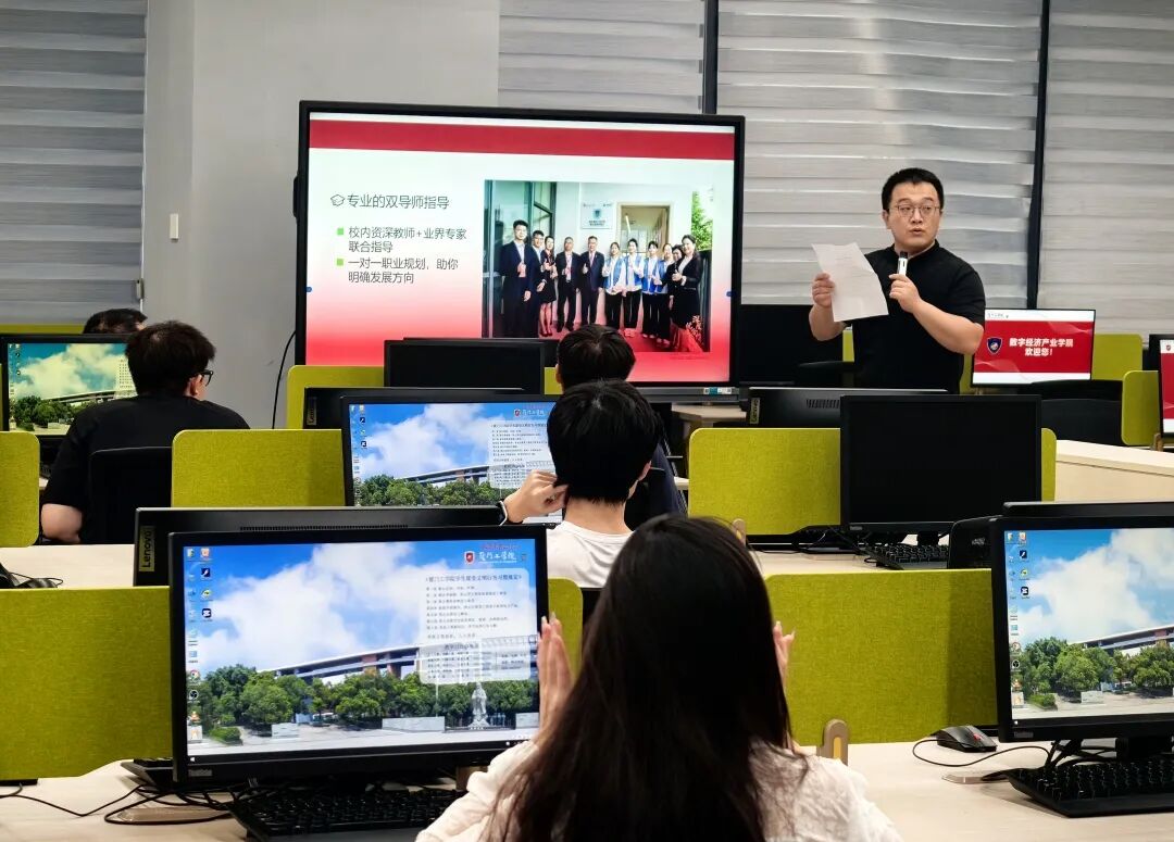 参观过程中,新生们围绕先进设备驻足观察,围绕产业升级迭代与热点新闻主动向教师追问应用细节与实践学习路径,现场互动氛围热烈。产业学院与行业同步的硬件配置、覆盖数字经济多领域的先进应用,不仅打破了新生对“专业学习”的传统认知,更让他们对未来通过实践掌握数字技能、参与产业项目充满期待。