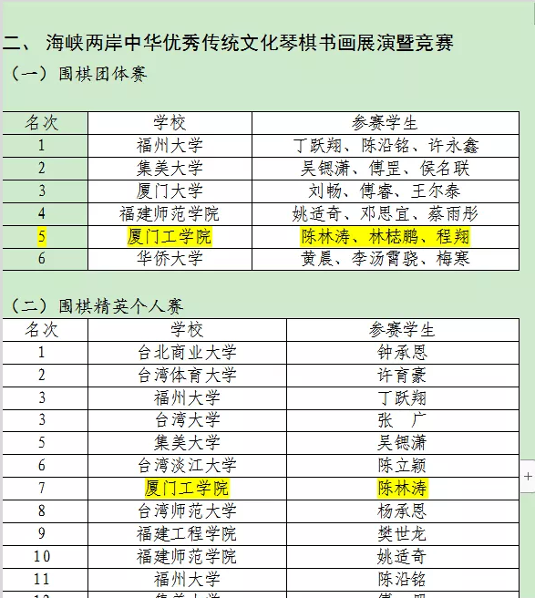 据福建省教育厅来文消息,在第五届海峡两岸大学生职业技能大赛暨创新成果展系列活动-海峡两岸大学生创新成果展览以及海峡两岸中华优秀传统文化琴棋书画展演暨竞赛中,我校学子喜获“围棋团体赛”第5名(参赛学生:陈林涛、林??鹏、程翔),陈林涛同学荣获“围棋精英个人赛”第7名的良好成绩。