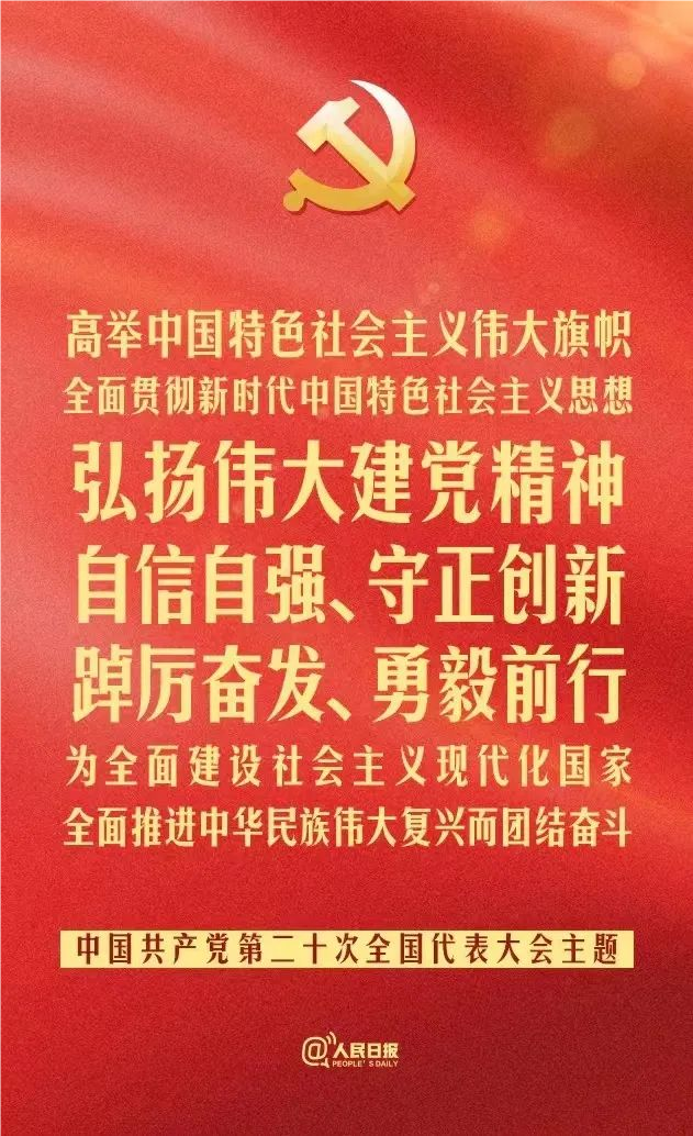 中国共产党第二十次全国代表大会16日上午在人民大会堂开幕。习近平代表第十九届中央委员会向党的二十大作出报告。习近平总书记说,大会的主题是:高举中国特色社会主义伟大旗帜,全面贯彻新时代中国特色社会主义思想,弘扬伟大建党精神,自信自强、守正创新,踔厉奋发、勇毅前行,为全面建设社会主义现代化国家、全面推进中华民族伟大复兴而团结奋斗。