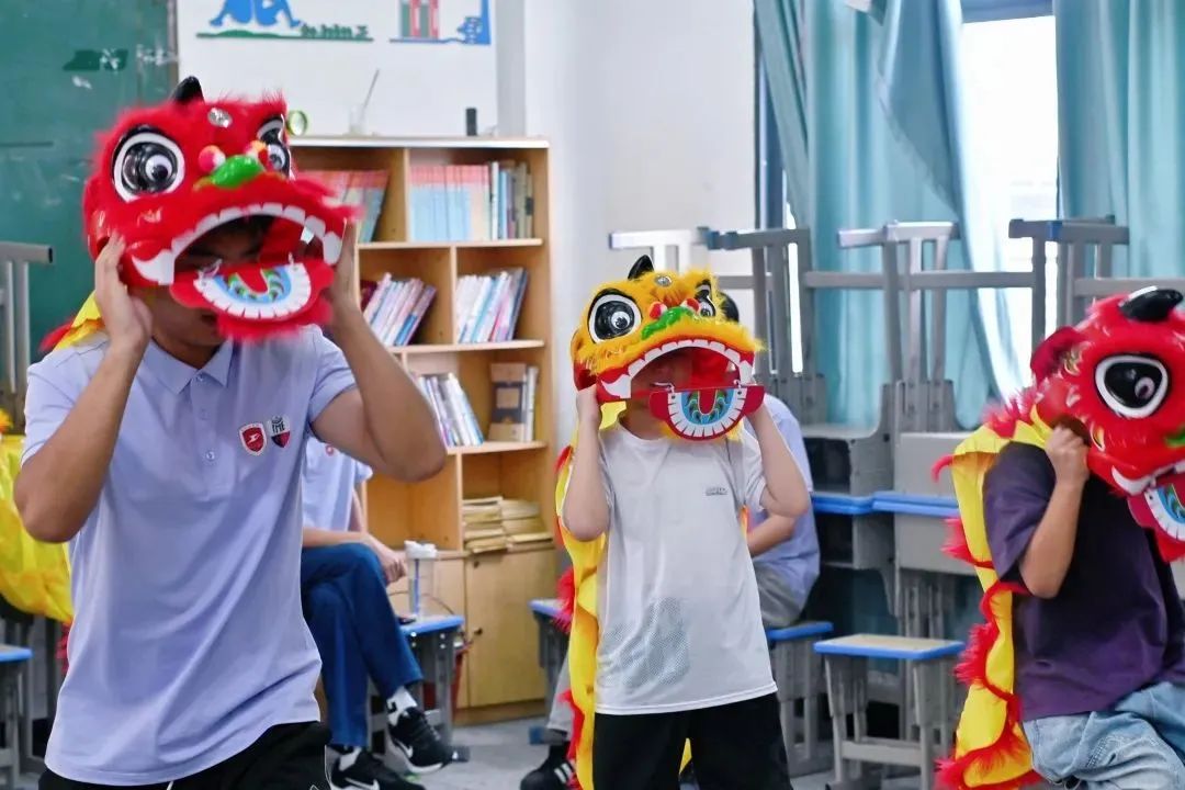 书法课堂上,老师们化身汉字美学的使者,以“合”“高”等汉字为例,深入讲解书法的结构之美。通过“加一笔造对称字”等互动环节,孩子们在书写中领悟汉字的美学与文化内涵。从生涩到流畅的笔画,不仅展现了孩子们的书写进步,更让汉字的审美与文化认同在他们心中悄然萌芽。舞狮课程是热血与传承的交融。老师们将传统舞狮的招式与节奏相结合,孩子们在鼓点的引导下,从生疏模仿到得心应手,逐渐掌握了舞狮的精髓。这一过程不仅锻炼了孩子们的身体协调能力,更让他们深刻体会到传统民俗中“团结协作、昂扬奋进”的精神内涵,让非遗文化在青少年中焕发出新的生机。