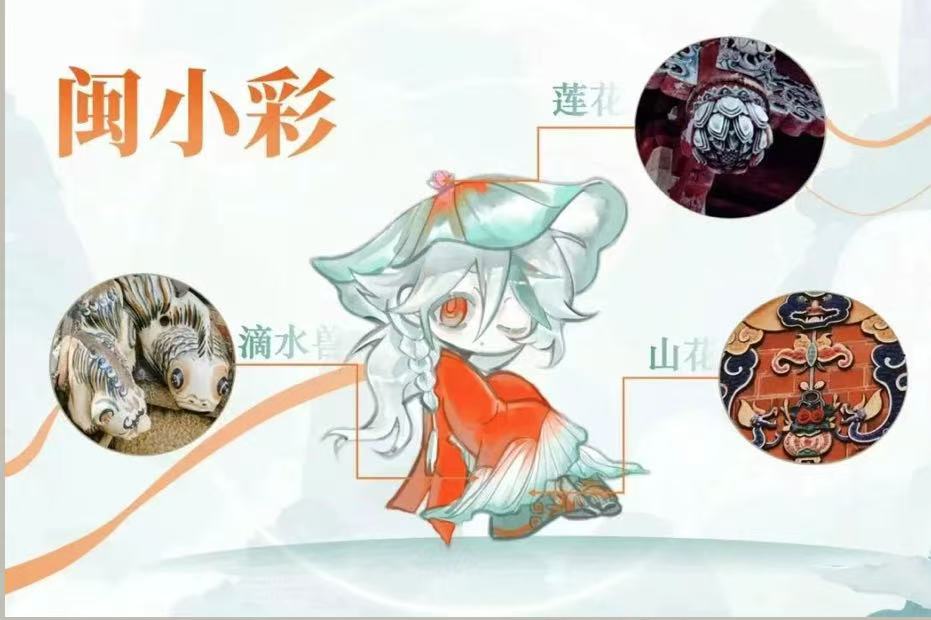 调研过程中,团队分工协作,结合借景、框景、藏景等经典园林手法,通过文字记录、影像拍摄等方式全方位留存现场资料,深入探讨传统村落与古建的活化利用路径,结合旅游开发与文化创意提出可行性保护方案构想。立足福建本土特色,队员们聚焦闽南古建筑中的滴水兽、燕尾脊、山花等独特元素,深耕文化创意转化。团队精心设计的文创IP形象“闽小彩”,融合德化白瓷瓶身造型、莲花元素及古厝滴水兽等闽南文化符号,以白、青、橘红为主色调,既彰显古建筑典雅韵味,又契合现代审美需求,通过简化提炼的古典纹路与灵动线条,实现传统精髓与现代风格的有机统一。依托“闽小彩”IP,实践队进一步开发系列文创产品,以传统园林与古建影像为蓝本,结合现代设计与市场需求,打造地域文化品牌。此举旨在打破地域与文化界限,推动闽韵园林文化走向更广阔的舞台,让“东方园林美学”在新时代焕发活力,为文旅产业发展注入新动能。