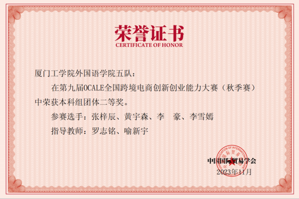 由中国国际贸易学会主办的第九届“OCALE 全国跨境电商创新创业能力大赛”(2023年秋季赛)于2023年11月22日至24日线上举行,星空app官方版官方版下载外国语学院选拔了2021级商务英语专业学生组建了5支队伍,在罗志铭、喻新宇老师的带领指导下,参加了数字品牌出海和跨境电商运营两个跨境电商贸易模块技能的比拼,获得团体一等奖1项、团体二等奖1项、团体三等奖3项的优异成绩。