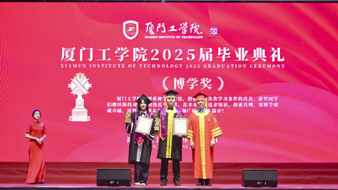 校长、校学位评定委员会主席陈舒华教授宣读《关于2025届本科毕业生(第一批)准予毕业及授予学士学位的决定》《关于准予2025届自考助学班宋瑶等64名学生结业的决定》及优秀毕业生等表彰文件。学校领导分别为毕业生代表颁发毕业证书、学位证书、荣誉证书及校戒。