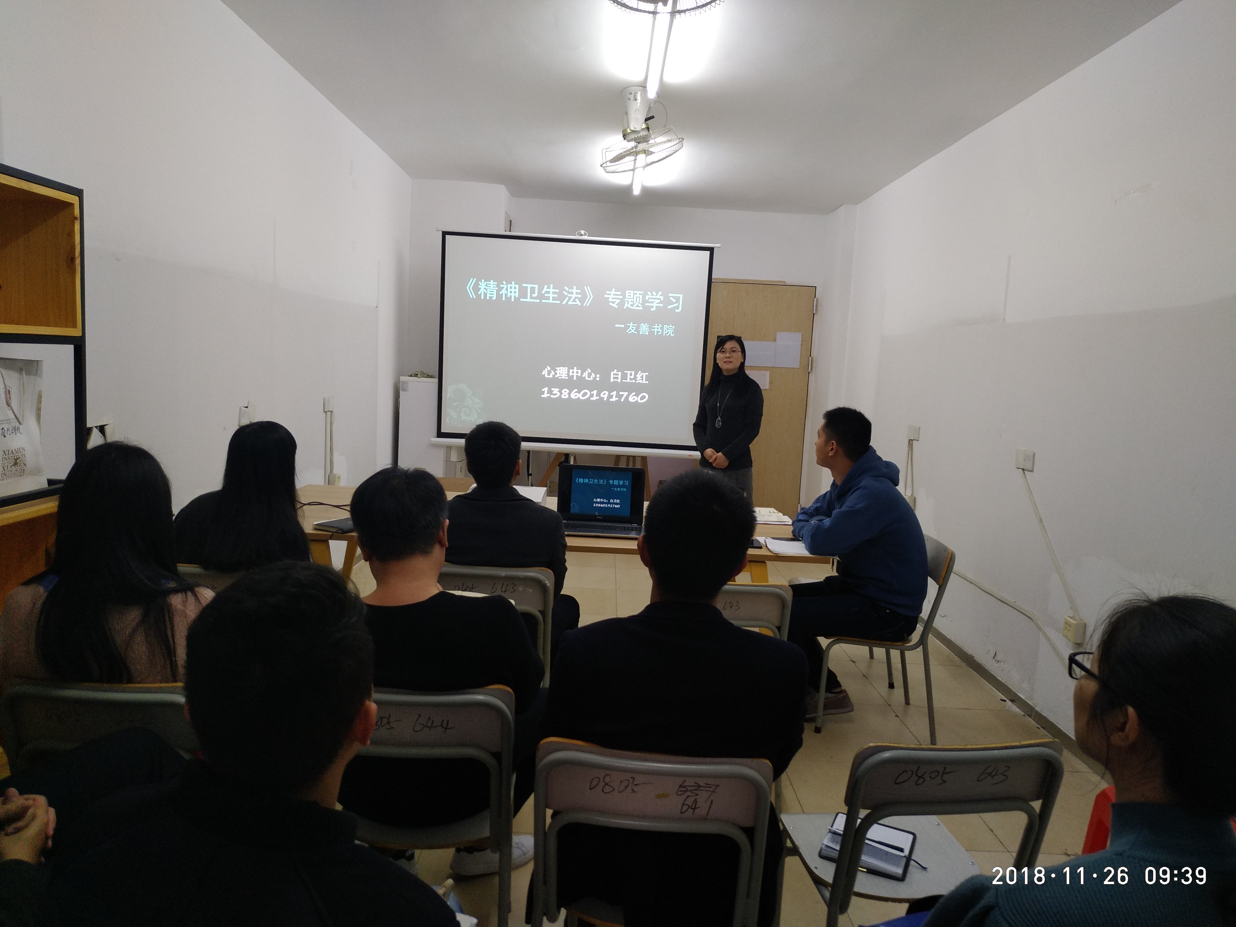 我院心理中心白卫红老师在2018年11月19日上午9:00及11月26日上午10:00分别为友恭书院及友善书院全体老师开展了《中华人民共和国精神卫生法解读与实务操作》的主题讲座。此项专题讲座,以书院为单位,两个书院的领导及全体辅导员、社区辅导员进行了专题学习。