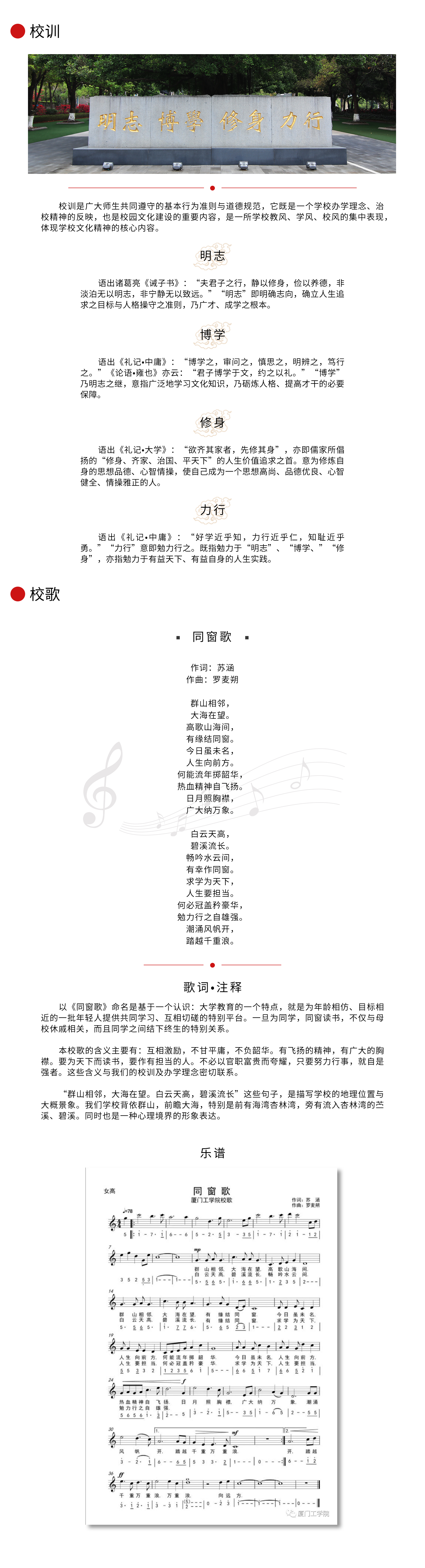 顶部白鹭取形于厦门市市鸟白鹭,中部齿轮象征星空app官方版官方版下载工科特色,又可同时解读为“天”、“人”、“工”三字之变化,具有天人合一、道法自然之寓意,蕴含我校的办学理念,也意味着将所有学子都培养成人的办学目标,下部的海浪造型与上两部分互为呼应,喻示我们学校的创办是在著名的海滨城市厦门一一海阔天空,在这里追求我们的人生理想。