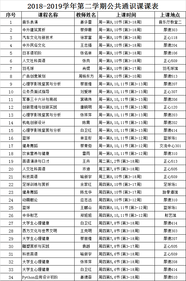 各院系、教师、学生: 经过全校教师公开申报,教学处组织学生选课,现2018-2019学年第一学期全校通识课课表已确定,请各教师、学生根据通识课课表进行上课。
