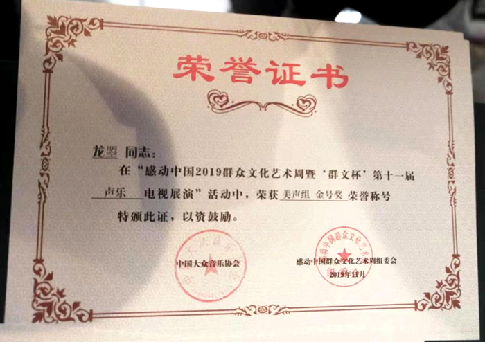 11月12日,由文化部直属音协举办的全国第十一届“群文杯”声乐大赛总决赛在中央电视台星光影视园演播大厅落下帷幕。艺术学院声乐教师龙�自诒窘齑笕�中表现出色,以歌曲《我的深情为你守候》获得全场评委的高度认可,最终以全场最高分95.90分荣获全国声乐总决赛美声组金奖。