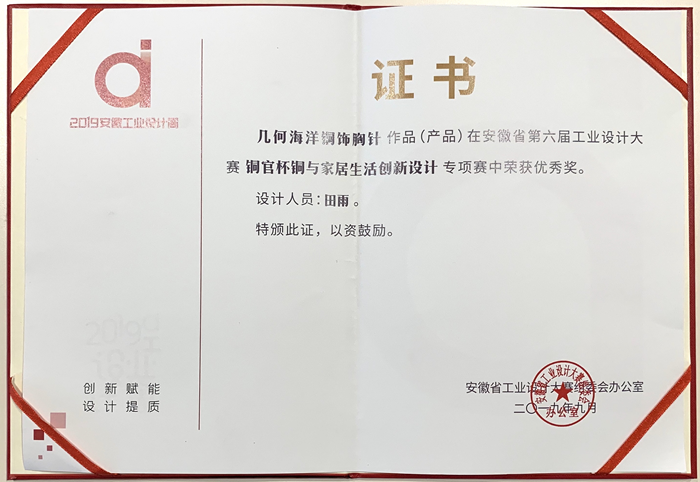 2019年9月,安徽省第六届工业设计大赛“铜官杯”铜与家居生活创新设计专项赛在安徽铜陵落幕。16级动画专业田雨同学和17级动画专业杨夏萍同学均参加此次比赛。由艺术学院孔月光老师、袁越老师指导的16级动画专业田雨同学获得大赛优秀奖及价值2000元的铜饰奖品。