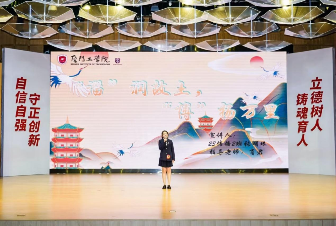 3号选手林家悦用“何为轻舟,何为有为呢?”这个问题,带着大家走进了中国的峥嵘岁月和厦工的璀璨辉煌,从科学家精神到航空精神再到厦工精神,无不体现着党的二十届三中全会精神。作为新生力量的我们,要当一叶扁舟,将个人理想投入到祖国这片汪洋大海的怀抱之中