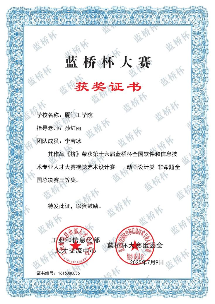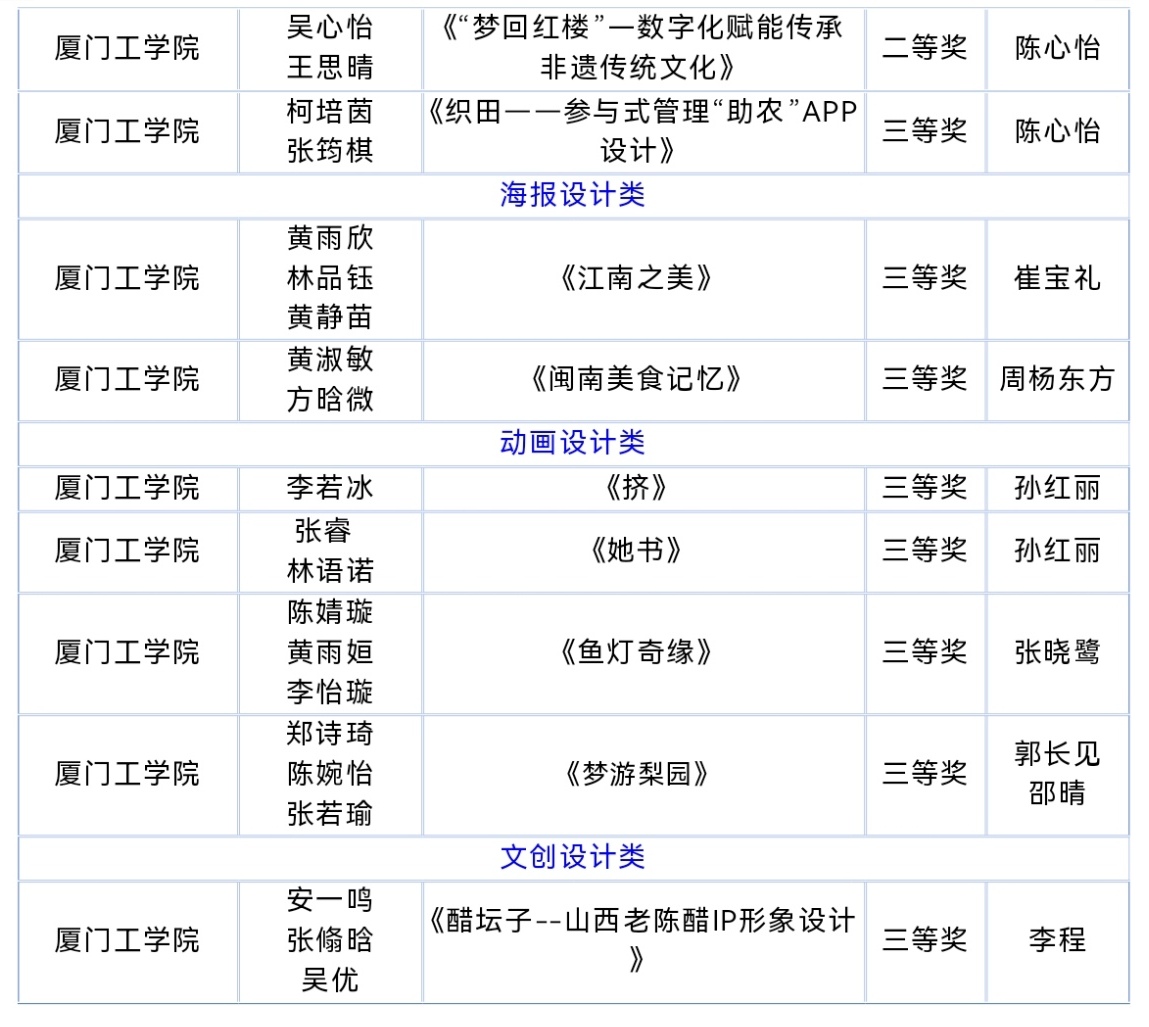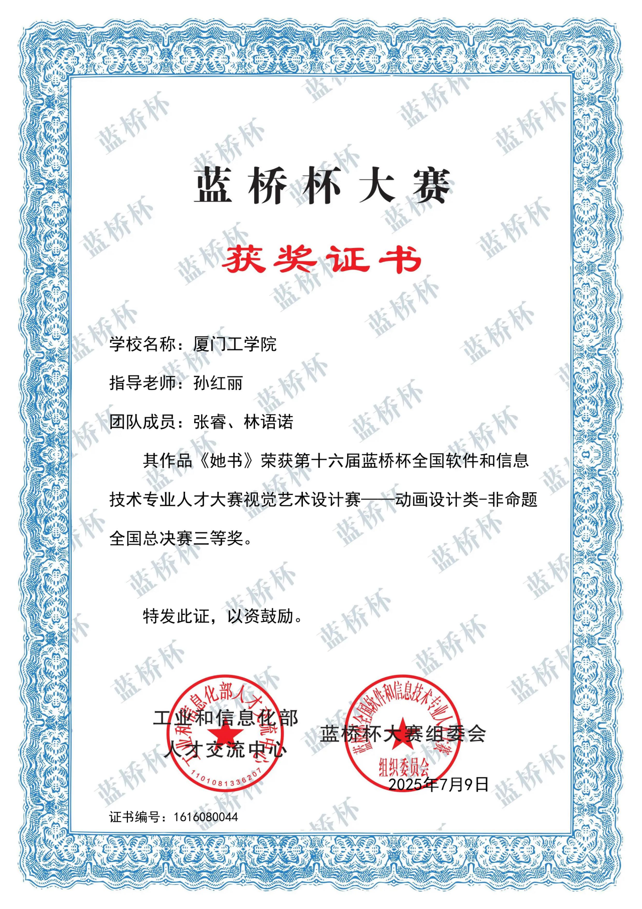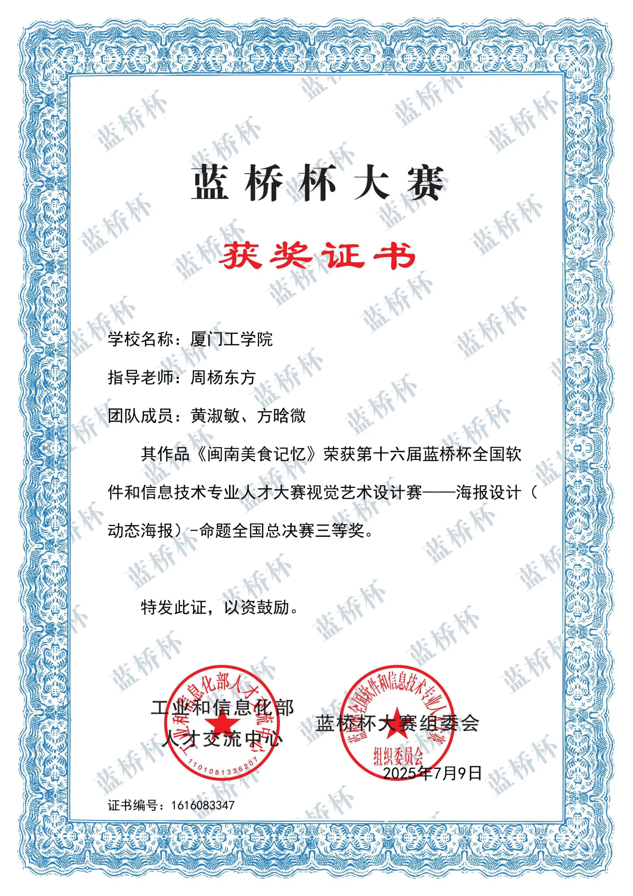 近日,由工业和信息化部人才交流中心主办的第十六届蓝桥杯大赛视觉艺术设计赛全国赛名单公布,我院在各个分项目取得较好成绩,我院学生作品获国家级奖项10项,其中二等奖2项,三等奖8项。此外,我院学子在福建赛区中还获得一等奖12项、二等奖18项、三等奖20项、优秀奖15项。